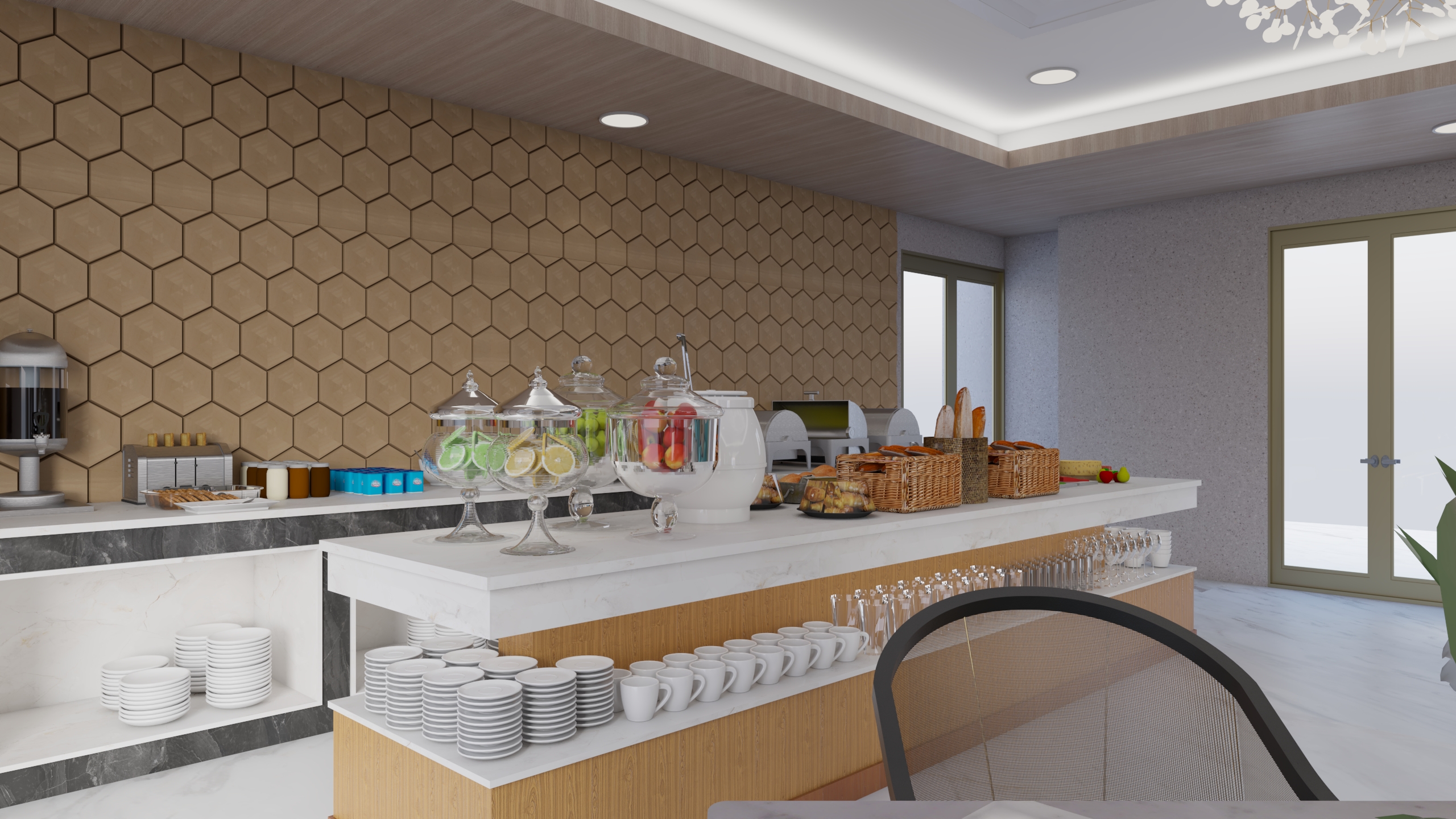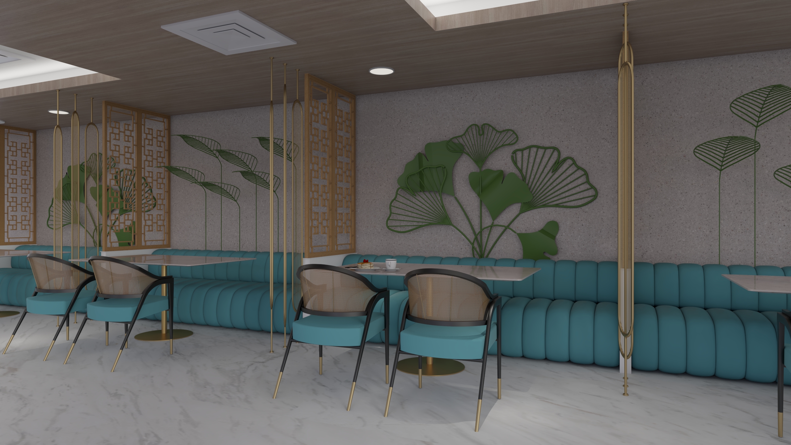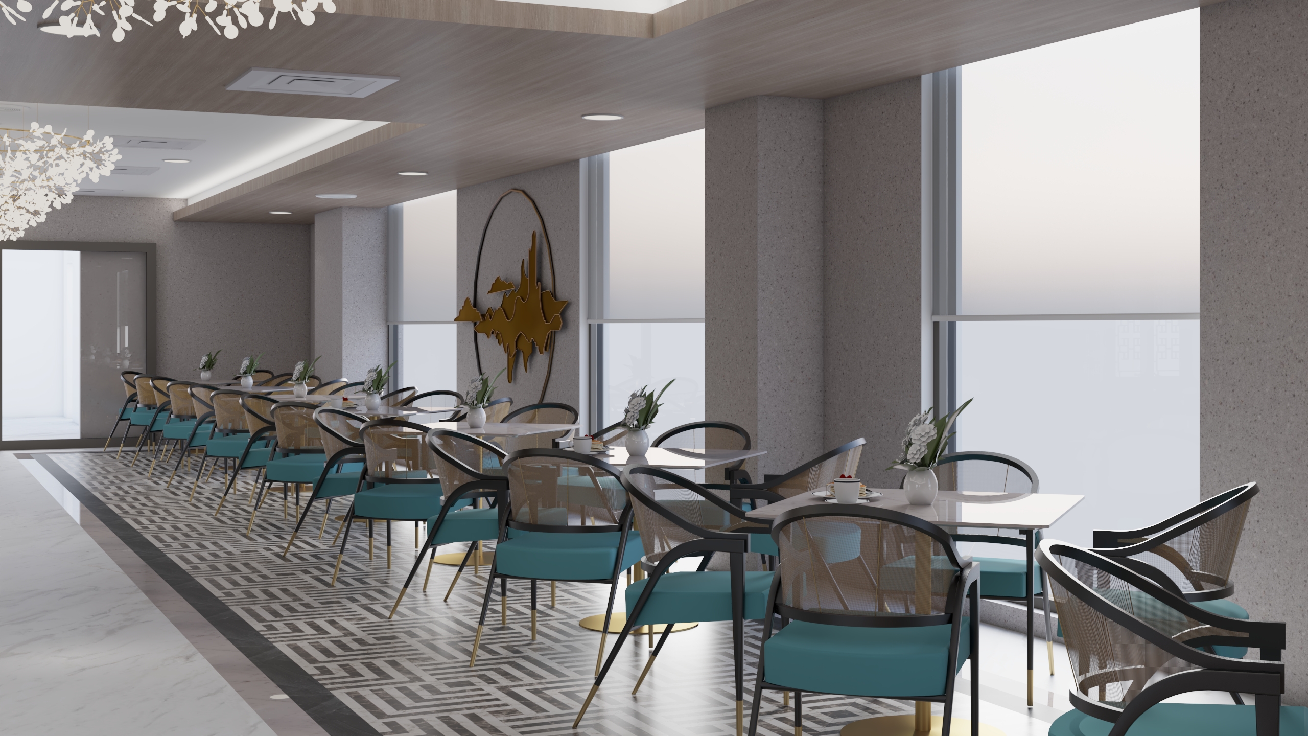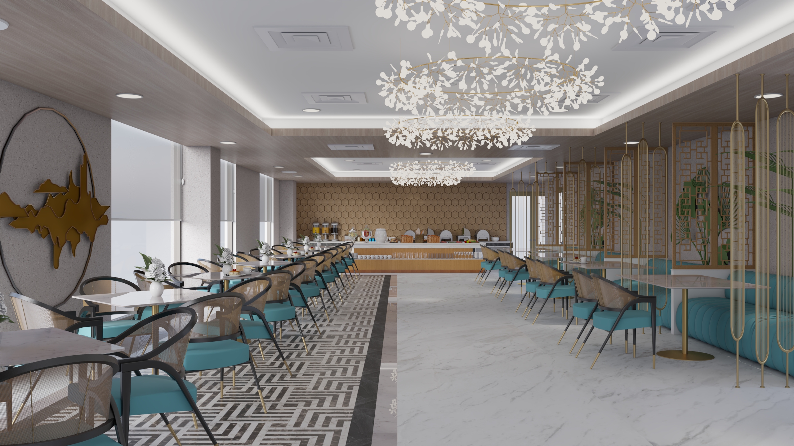 Hotel Buddha Star My role involved the design and layout of the furnitures, wall elevations, material choice and lighting and prepare the 3D visualizations of different scenes. Cool colors were chosen for the design.