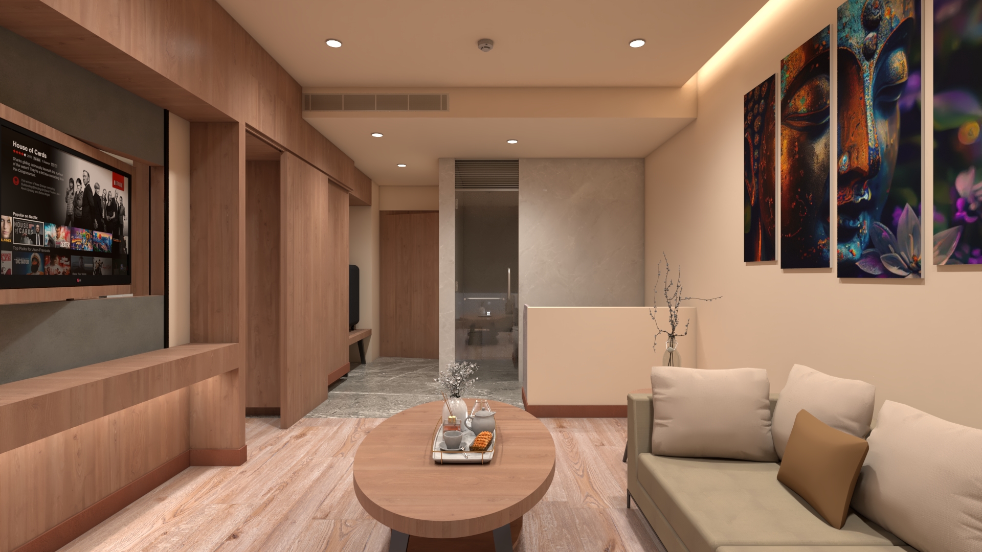 My role involved the design and layout of the furnitures, wall elevations, material choice and lighting and prepare the 3D visualizations of different scenes. Warm colors were chosen for the design.