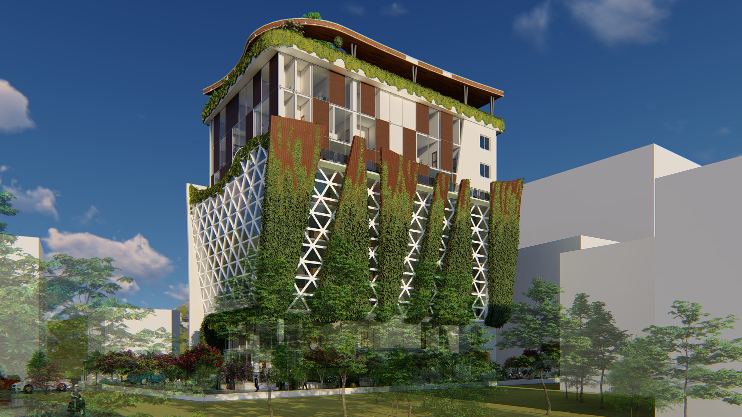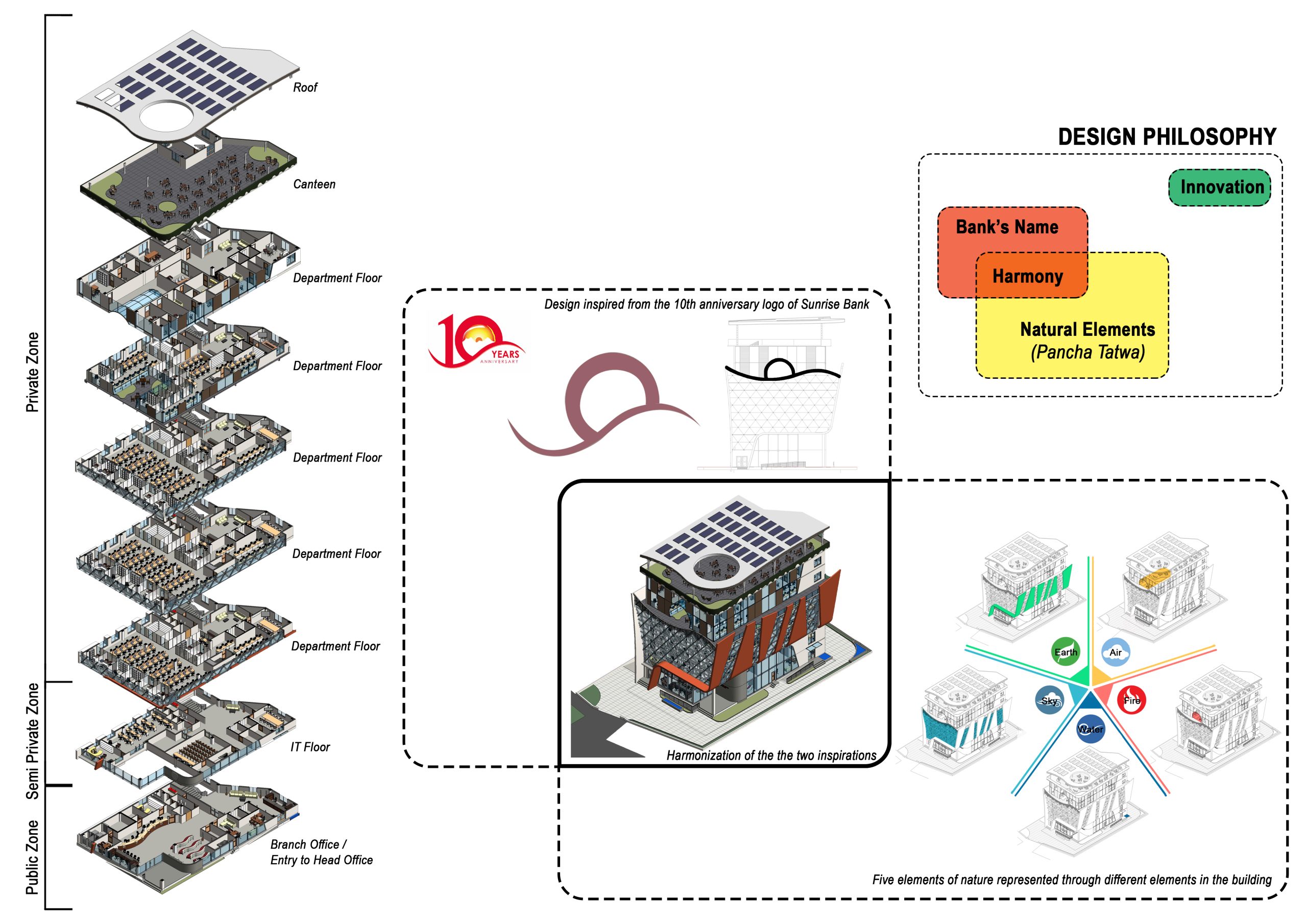 This project was prepared for the “corporate office complex” of Sunrise Bank Pvt. Ltd. to accommodate 350 office staffs with necessary facilities within a total built-up area of 37150 sq.ft. The proposed building reflected the modern architecture and correlate its feature with the natural environment. Design was motivated with the concept of five nature based elements for the sustainability. I was one of the team members of this project and assisted in preparing the design proposal to be sent to the client.